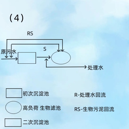(2)是应用较为广泛的高负荷生物滤池系统。处理水回流滤池前,可避免加大初次沉淀池的容积,生物污泥由二次沉淀池回流初次沉淀池,以提高初次沉淀池的沉淀效果。